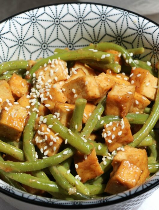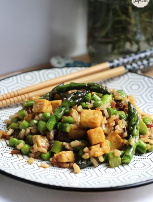 Wok d’asperges et de petits pois, dés de tofu et riz complet – recette vegan
