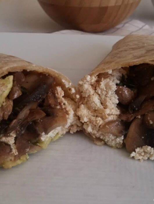 “Piadine” végétales à ma façon: poêlée de champignons, ricotta végétale faite maison et tartare d’avocat