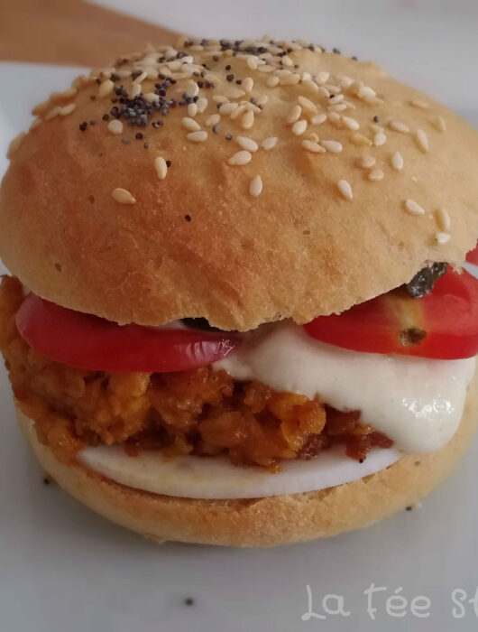 Burger de soja aromatisé au curry et au curcuma, petits pains à la farine de kamut et mayonnaise maison….tout végétal !