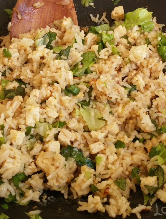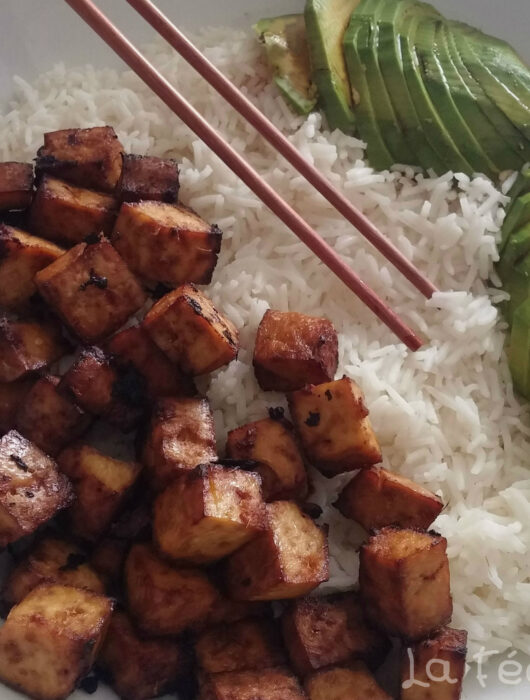 Tofu mariné et grillé, riz basmati et avocat en tranches