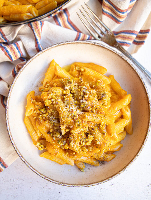 Pâtes à la courge parfumées au curry & pistaches concassées