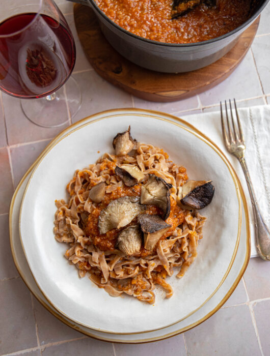 “Tagliatelle” fraîches aux cèpes, ragoût de petits légumes et champignons grillés