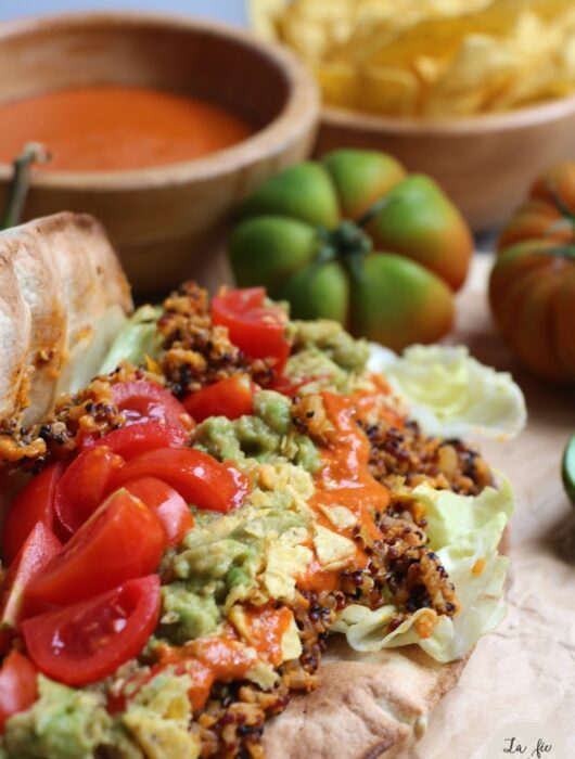 Tacos mexicain: seitan et quinoa, sauce au poivron et guacamole