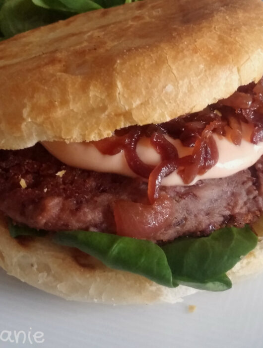 Burgers de haricots azuki, sauce rose et oignons caramélisés
