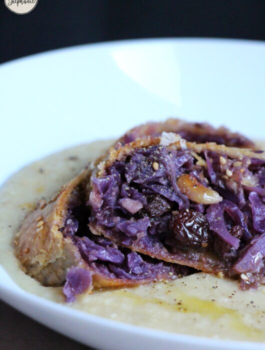 Strudel aux deux choux sur un lit de purée de fèves