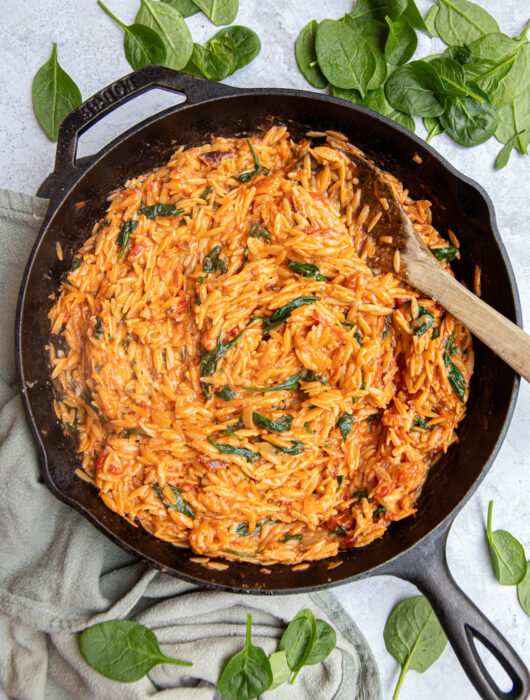 Orzo à la sauce tomate et aux épinards