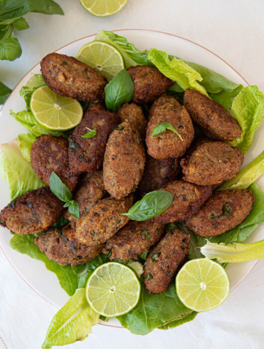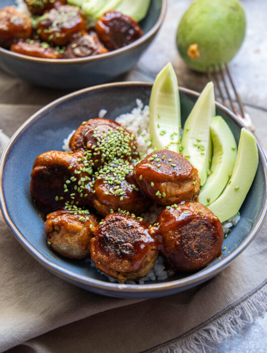 Boulettes moelleuses pois chiches et aubergine rôtie, sauce sucrée salée