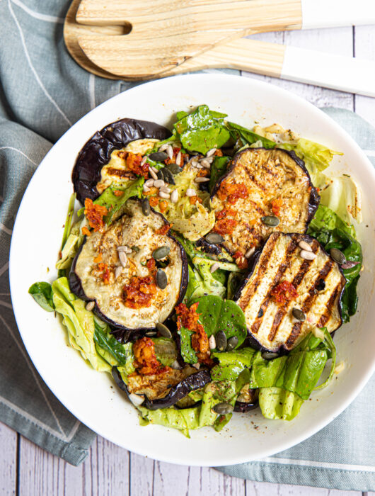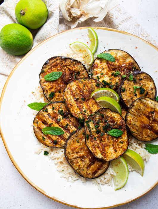 L’aubergine en fête, un article, deux recettes : aubergines grillées et couscous, sauce blanche à la menthe et tartinade d’aubergines aux câpres