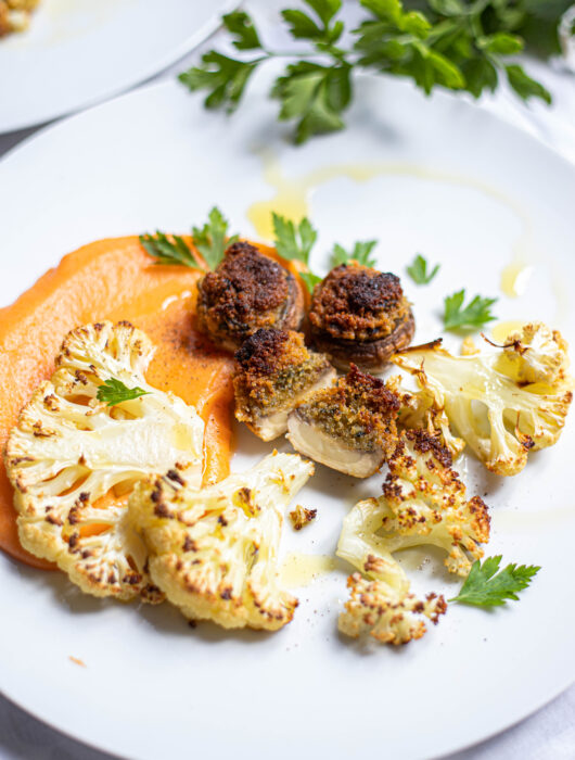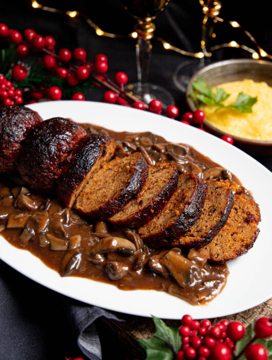 Rôti de seitan aux cèpes, sauce bourgignonne aux champignons et polenta